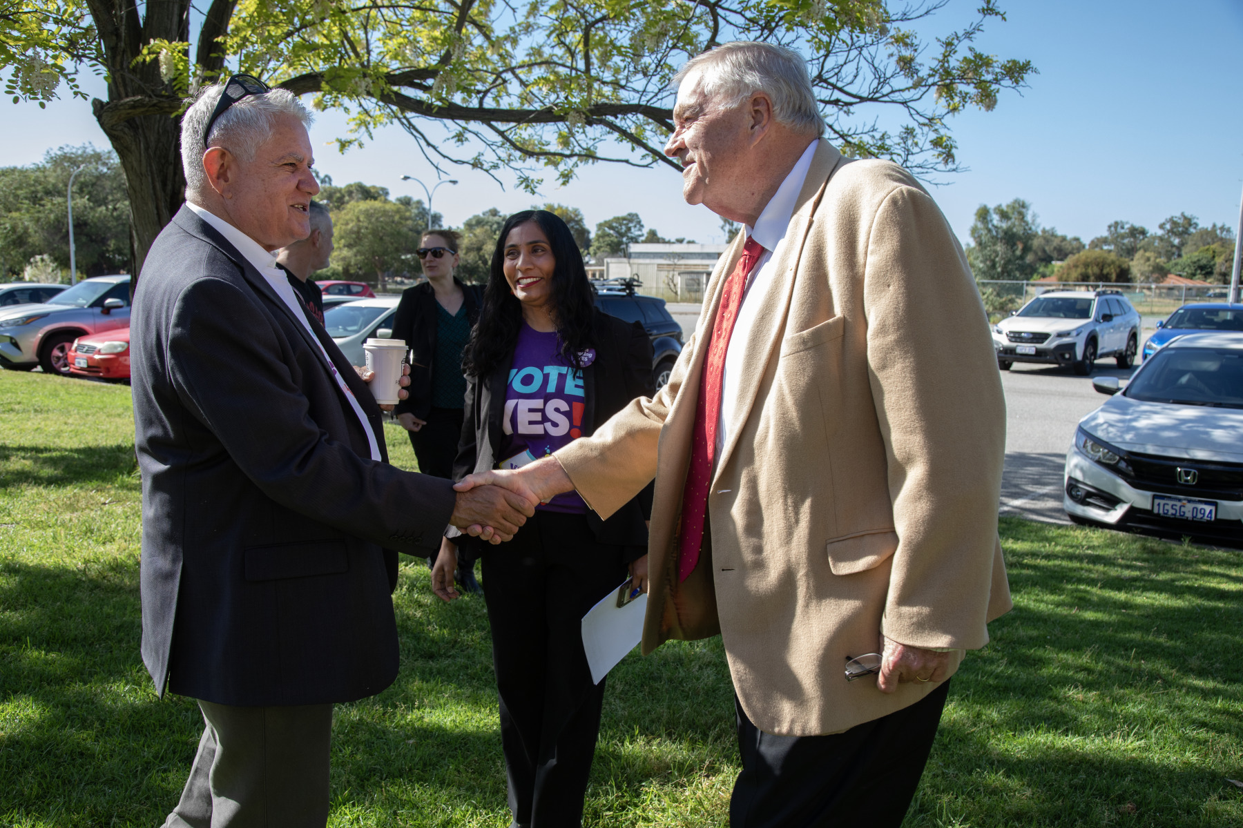 BA2493/3308: Ken Wyatt greets Kim Beazley at the Bentley Early Voting Centre while campaigning for the Voice to Parliament with Zaneta Mascarenhas MP looking on, 4 October 2023