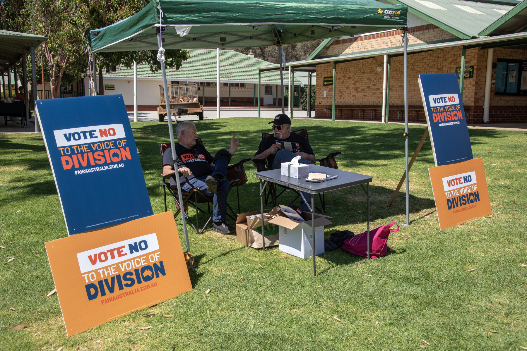 BA2493/3310: At Bakers Hill Primary School polling station 'No' campaign volunteers (L-R) Peter Wood and John McGreevey, 14 October 2023