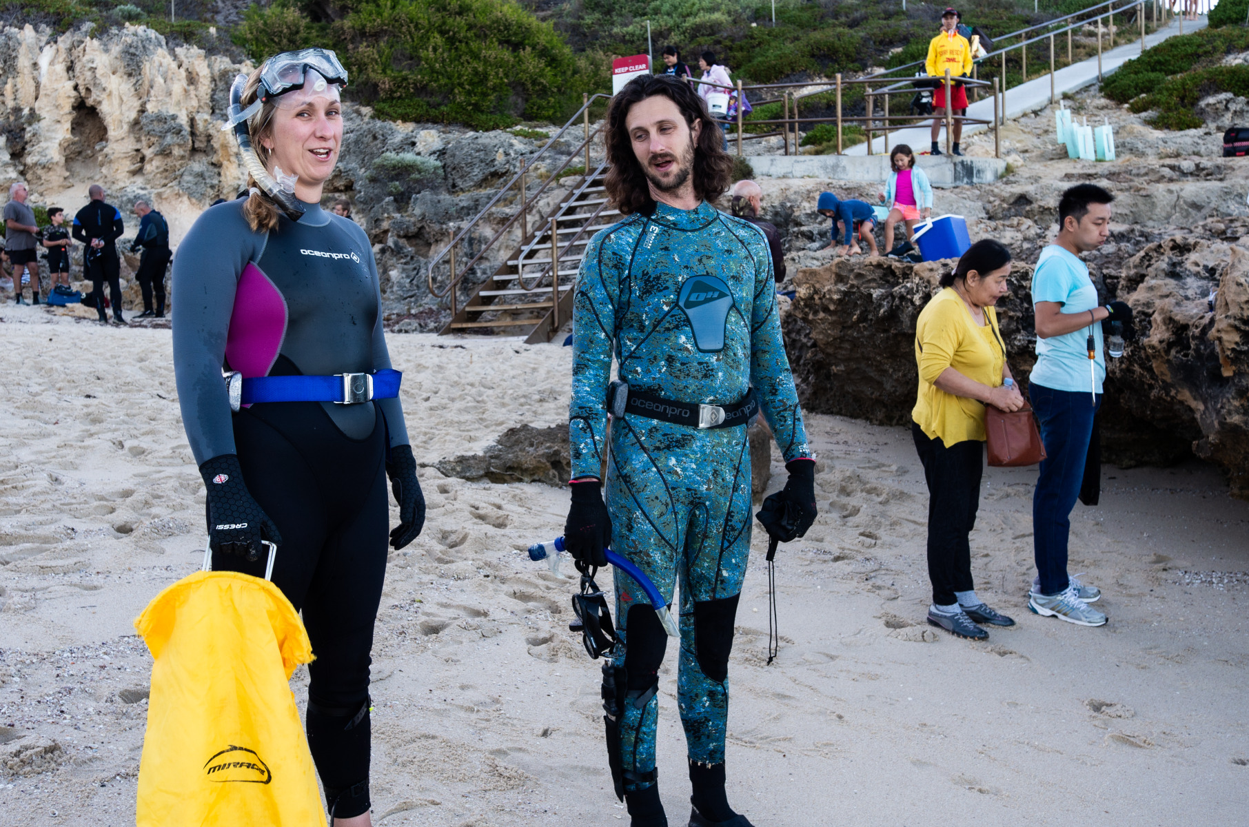 BA3370/281: Two people stand at the ready, well equipped with wetsuits to protect against the sharp reef and the water which is starting to cool down, April 2021.