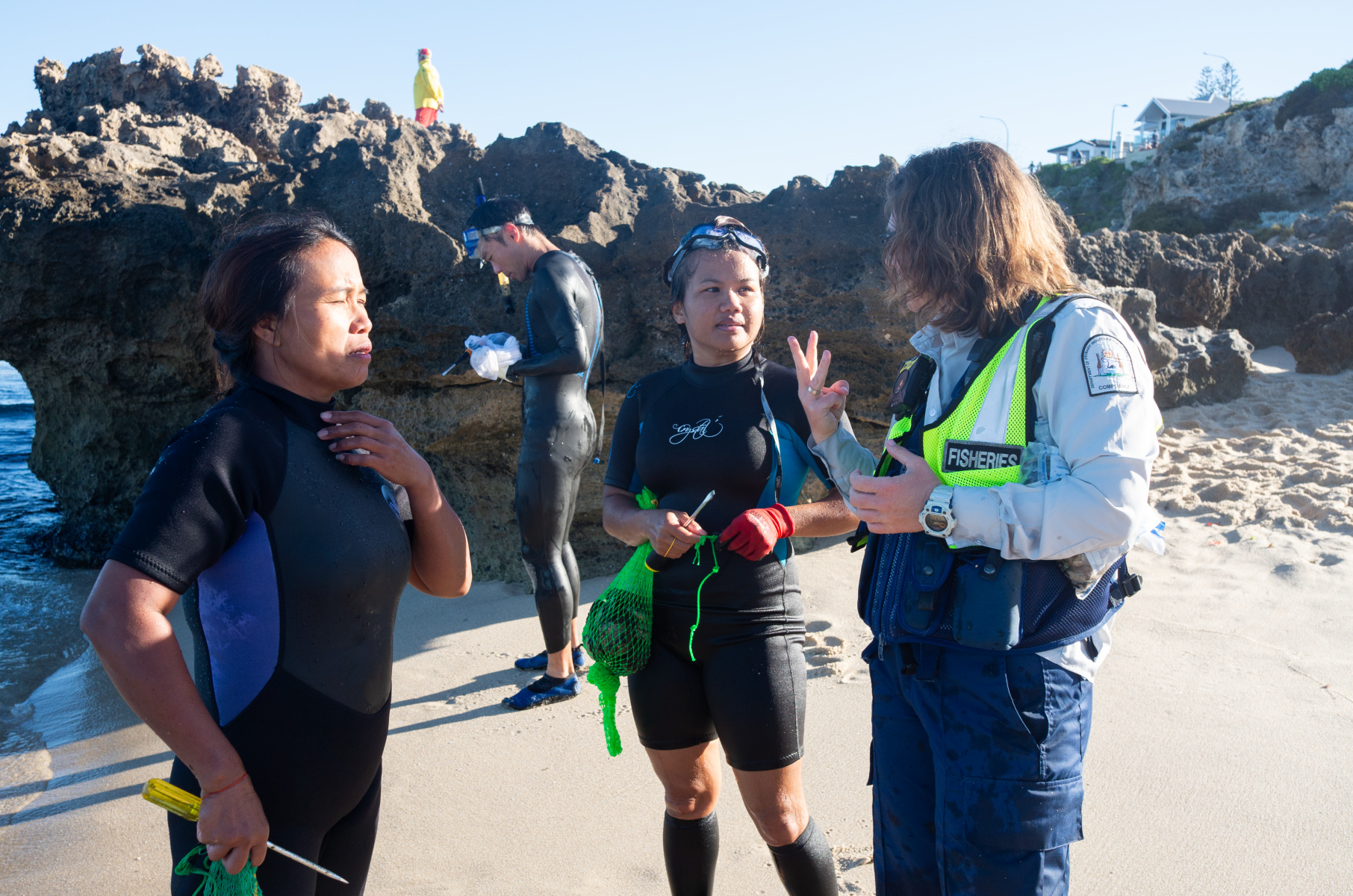 BA3370/284: A representative of the Department of Fisheries monitor the abalone take very carefully and take the time to talk to fishers about their limits, April 2021.