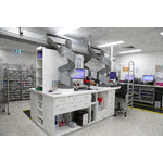 Photographer's notes: BA2493/2412: Dispensary within the Pharmacy, ground floor level. The image shows chutes on counter - Prescription drugs are loaded into the robot until such time as they’re needed to be dispensed at which time they come down the chute BA2493/2413: Dispensary robot within the Pharmacy, ground floor level. View inside the dispensary robot, showing rows of packaged prescription drugs on either side of corridor and the robotic arms (2) which select and dispense the selected drugs.