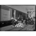 Unloading frozen lamb carcasses from an E class cold storage railway van onto a sling to be loaded onto a ship.