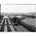 Elevated view. Various rolling stock is in the yard including a goods wagon R-1829 loaded with bagged grain; goods wagons; livestock wagons with good detail of plank roof; brake van with clerestory roof. The town is in the background.