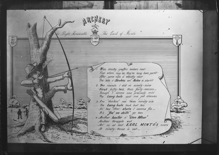 Archery - a postcard; portrait of Gladys B. Poynter (a copy of this in BA989 is inscribed 1903); opening of Cottesloe Golf Club Ladies Links 6 June 1903; tribute to Captain Wallace written under a cartoon about the Perth Golf Club (J. Wallace was captain of the club in 1905); Charles, Alexander and John Mitchell Christie (found also in the Christie Collection BA989 with same insciption plus 'The Christie brothers'); man playing the piano; various scenes and unknown people.022357PD is a photograph of an illustrated poem titled 'The adventures of 'Ladybird' attributed to Captain Wallace. The poem is based on an event described in an article published in the Sunday Times 29 March 1903, p.1b: Subiaco sensation: Attempted highway robbery. The article reads: A daring attempt to stick up and rob Mr Ralph Deering, manager of the W.A. Lime Supply Co., occurred between Subiaco and Claremont yesterday, shortly before midday. Deering was conveying 300 pounds from the office to the works in order to pay the men their wages. He was on horseback, and when proceeding through the scrub three masked and armed emulators of Dick Turpin blocked his way and pointing their revolvers at him told him to bail up. The horse Deering was riding was young and restive and shied to the right. Seizing the opportunity Deering dug his heels into the colt and away he flew into the bush. The desperadoes followed for about a quarter of a mile, and then gave up the chase. The matter was referred to the police, who set to work with all expedition to hunt up clues. During the afternoon Detective Porter arrested a man named O'Donoghue alias 'The Crow', who it is alleged, may be one of the trio of bushrangers, though at a late hour last night he had not been identified by Deering as one of the gang.022353PD us a cartoon commenting on the cost of joining the Perth Golf Club presented to Captain Wallace. The inscription reads: To Captain Wallace with the compliments of fellow golfers in recognition of the admirable way in which you have managed the Transport Dept. and your cordial goodfellowship throughout the season.Captain Wallace was Capt. James Wallace, statistician working for the Mines Dept. He and his wife Nellie lived at 267 Adelaide Tce., Perth (see Post Office Directory, 1903, Blue Book, 1903, Electoral Roll, 1903) J. Wallace was Captain of the Perth Golf Club in 1905.