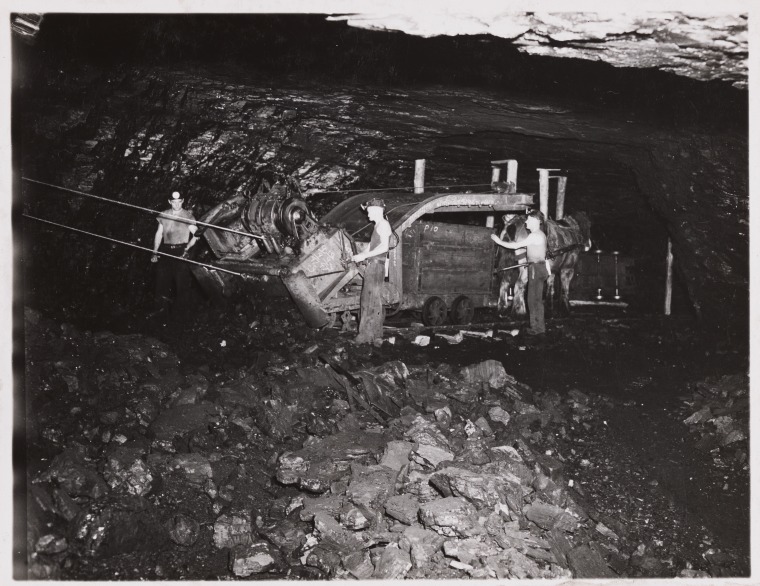 Pit pony harnessed to a scraper and loader in a shaft of the Cardiff Coal Mine, Collie.
