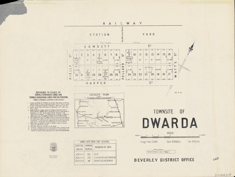 "29/4/14" Cadastral map showing land use. Includes locality plan. Lists town lots open for leasing and conditions for land applications. Part of collection: Townsite maps, Western Australia.