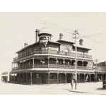 Photograph taken across the intersection of William and James Streets to show two sides of the hotel. Good detail of the iron lace.