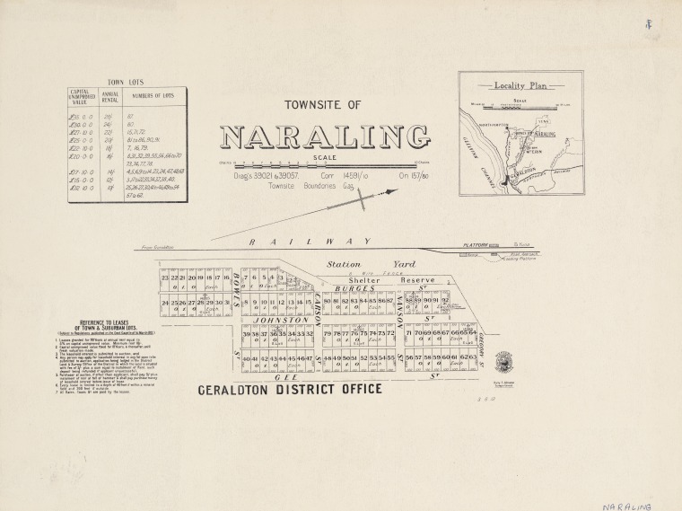 "3/8/12" Cadastral map showing land use. Includes locality plan. Includes list of town lots open for leasing, and notes on conditions for leases of town and suburban lots. Part of collection: Townsite maps, Western Australia.