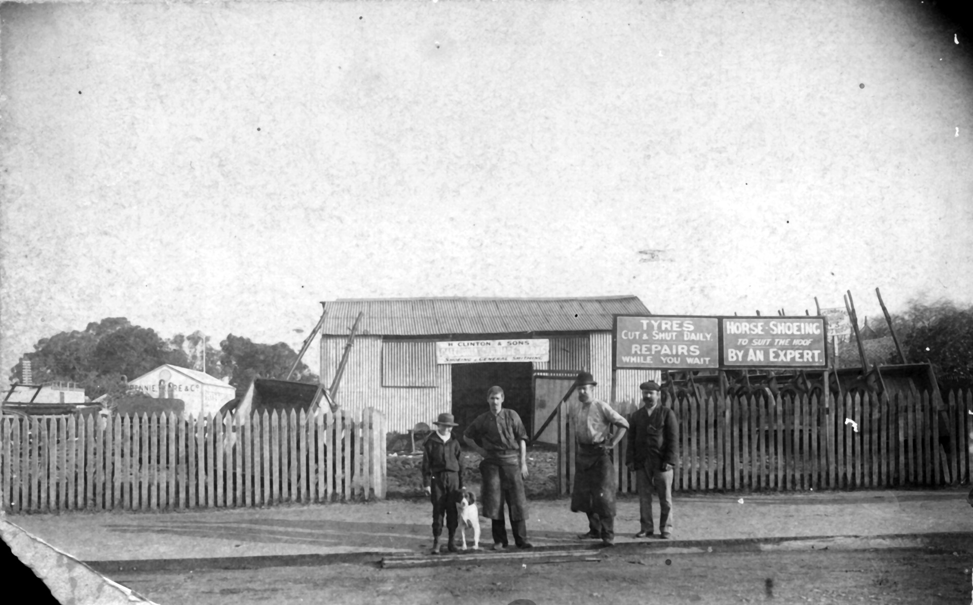 1. 005681D Grandma Clinton in automobile; 2. 005682D Harry Clinton (Second left) and Grandfather Clinton (Third left) with others outside family blacksmith shop in Wellington Street, Perth.