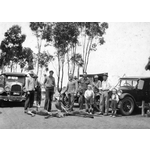 Group of men and boys with kangaroos and guns. Posing in front of cars.