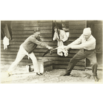Harold Boas (left) and Charles Diamond (right). A.J. Burgess looking through window. Location is Lake Preston Lodge, Easter 1927. (written on back of print)