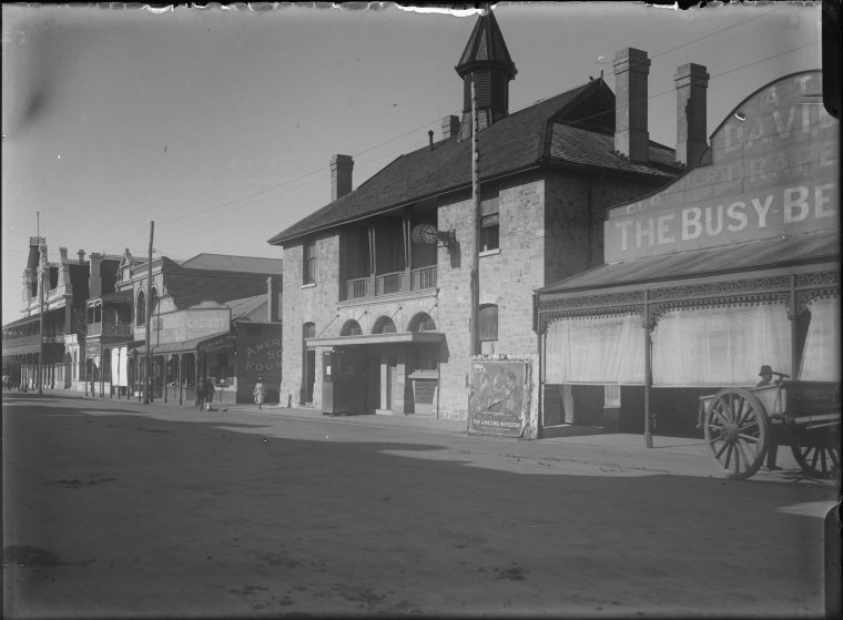 Title devised by cataloguer. Dated from old movie poster propped up between the posts between Busy Bee and the post Office. The poster advertised the silent move The Amazing Imposter (1919). As the poster is very tattered this image is probably between 1920 and 1925.