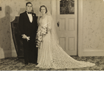 BA1493/8: Bride and groom on their wedding day. The groom, Des, is a cousin of Effie Fellows.