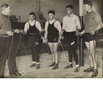 BA1493/9: Five men with skipping ropes in a gymnasium, of which Sam Chapman on the far left, is the coach, 1936.