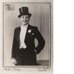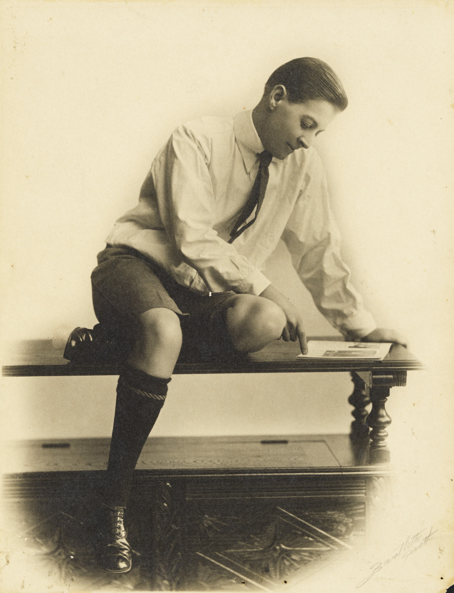 BA1493/5: Studio portrait of Effie Fellows seated on a dumb waiter wearing shorts and a shirt and tie.