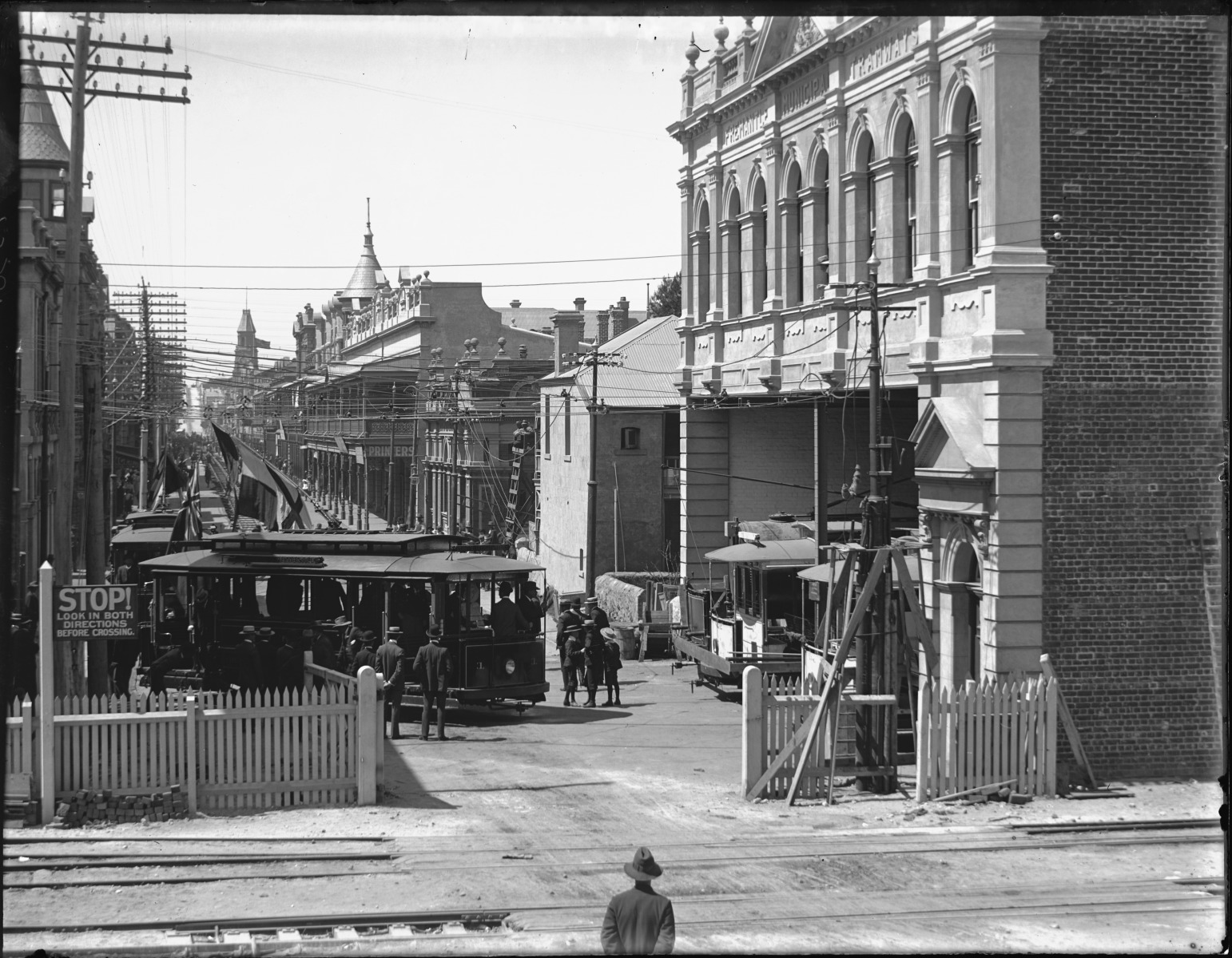 009530PD: Trams decorated with flags leave the carbarn in High St, Fremantle for the opening of the Fremantle Municipal Tramways, 30 October 1905