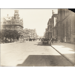 Shows the entrance to the underground toilets in the middle of the street. Moirs Chambers on left, corner of Barrack Street. Treasury Buildings on right hand side.