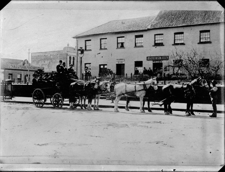 Previously dated to 1869, now dated to between 1891 and 1895. Over the door is the name of the proprietor: W.S. Savage. William Savage identifies himself as Proprietor of the Freemasons Hotel for the first time in an advertisement in the West Australian 19 December 1891, p.1. Previously the proprietor was H.B. Chipper (see West Australian 5/10/1889, p.3) and prior to this James Joseph Dearden (note in West Australian1 May 1884, p.3 police court evidence) and previously E.S. James who died in 1878. The Freemasons Hotel was sold by auction 24 Dec. 1895 (West Australian 26 Dec. 1895, p.5). By 1897 the Palace Hotel had been built on this site.Crowded horse-drawn carriage in front of hotel building.
