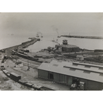 The entrance to Fremantle Harbour. At the bottom of the photo is a wagon numbered J3097. This wagon was reclassified H3097 on 24 Oct 1900 so the photo must be before that date and after 1896 when the wagon was new. The large van 3 wagons to the left is numbered G3423 which was new in 1898. (information supplied by railway historian A.S. May). This dates the photograph to 1898-1900. The building in the centre of the photograph surrounded by a picket fence is the office of the Harbour Works Department. On 17 February 1904 this building was moved to Cliff Street for use by the Fremantle Harbour Trust (West Australian 18 February 1904, p.6)