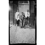 Reverend David Abbott, Jack Spear (in wicker wheelchair) and an unidentified Aboriginal man in front of the Anglican church building at Moore River Native Settlement.