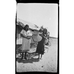 Two unidentified young Aboriginal women holding babies outside makeshift building.
