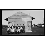 Group of Aboriginal children and Caucasian adults outside a corrugated iron building, Moore River Native Settlement.