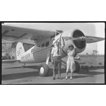 Title supplied by cataloguer. This image has been preserved and made available by the Historical Records Rescue Consortium Project supported by Lotterywest. 217223PD is Jimmy Woods and an unidentified woman in front of Horrie Miller's plane. VH-UVK Lockheed DL-1A Vega Special (construction number 155) Built in 1930, by Detroit-Lockheed Aircraft, Burbank, California, USA. Registered NC372E to Detroit Lockheed Aircraft. Registered as G-ABFE (Model 5 Vega) 30/9/1930 (an alternative source suggests 16/12/1930) to Lieutenant Commander Glen Kidson (who intended to build Lockheed Vegas under licence in the UK). It arrived in the UK by ship 1/1931 & was re-registered G-ABGK 3/1/1931 to Lt. Cmdr Glen Kidson, to incorporate his initials. Its UK Certificate of Airworthiness (V45) was issued 17/1/1931 and the aircraft was test-flown by Kidson at Croydon Aerodrome, London on 31/1/1931. It flew a record-breaking flight Croydon-Le Bourget 21/2/1931 & was used for other record flights, including Croydon-Capetown (via Napoli, Malta, Cairo, Kosti, Malakal, Kimusu, Salisbury & Bulawayo). Glen Kidson & his co-pilot Capt. T.A. Gladstone, were killed in a crash in South Africa 5/5/1931, in DH.80A ZS-ACG. G-ABGK was dismantled & shipped back to the U.K. by Kidson’s co-pilot Owen Cathcart-Jones. Cathcart-Jones continued to fly G-ABGK on behalf of Kidson’s family until its last flight 24/3/1933, when it was hangared at Hanworth Aerodrome. Purchased 8/1934 by Horrie C. Miller, sight unseen, for the Centenary London-Australia Air Race. Test-flown at Hanworth, 15/8/34, by Capt. Jimmy Woods, for its new owner. Overhauled by Dutch airline K.L.M. at Waalhaven, Rotterdam. Entered in the 1934 Centenary Air Race (U.K.-Australia) London-Melbourne (as N° 36) with Jimmy Woods as pilot and Don Bennett as navigator. It departed 20/10/1934 & flew to Marseilles, Roma & Athens. On 21/10/1934 it continued on to Aleppo, Syria, where Jimmy Woods made a heavy landing, causing the undercarriage to collapse. It was withdrawn from the race, dismantled & shipped to Fremantle. It arrived at Perth 1/1935, for rebuild at the MMA workshops. First-flown in Australia 22/8/1935, as G-ABGK. Miller was initially unable to obtain an Australian Certificate of Airworthiness (CofA), as it was an American aircraft. However, it was allowed to fly as G-ABGK, using its U.K. CofA. Capt. Woods flew the aircraft in the Perth Aerial Derby 5/10/1935. It raised more than a few eyebrows there, as it flew faster than the RAAF's Hawker Demon fighter-bomber. Its first MMA service was a charter, Perth-Kalgoorlie-Forrest-Ceduna-Adelaide, 13/10/1935. Horrie Miller requested the registration VH-BGK, to minimise repainting, but this was refused. It was test-flown by Horrie Miller 19/6/1936, in preparation for an Australian CofA. Registered VH-UVK to H.C. Miller 23/6/36 (Certificate of Registration No: 540), with an Australian CofA. The aircraft was registered to & belonged to Horrie Miller, rather than MMA, but was used by MMA on an ad-hoc basis, including communications between MMA bases & occasionally picking up mail from delayed flights. At one stage, R.M. Ansett tried to lease the aircraft, for use Melbourne-Hamilton, but Horrie Miller would not release it. MMA applied to have the Vega included under its airline licence in 8/41. However, it was impressed into service by the RAAF on 11/11/1941, and allocated RAAF serial number A42-1, just as Horrie Miller was planning to register the aircraft to MacRobertson Miller Aviation Co. Struck-Off the civil aircraft register 5/11/1941. Flown to RAAF 1 Aircraft Depot, Laverton, Vic, for use by Northern Area Headquarters. It was camouflaged, and saw service with 24 Squadron and 33 Squadron. It ground-looped at Cairns 17/6/1942, damaging the rear spar, an aileron & wing rips. It was trucked to Townsville & placed in storage. Repairs by Aircrafts Pty. Ltd. began in 10/1942 & took some 12 months. On 24/11/1943 it entered service with 3 Communications Unit, Mascot, Sydney. Declared surplus 3/1944; having flown only some 46 hours with the RAAF, and was issued to the Department of Civil Aviation (DCA). The DCA initially intended to issue the aircraft to Ansett Airways, but, as a result of reports by RAAF pilots of longitudinal instability problems, decided that the aircraft should remain in storage at 3 CU, at Mascot. During 10/1944, the DCA recommended to the RAAF that the aircraft be scrapped. Both Butler Air Transport (28/8/1945) & Jimmy Woods (15/10/1945) were interested in it. However, there was no sale, at least partly because the DCA stated that they would not renew the CofA, due to its stability problems. During 10/45 it was dismantled & trucked to RAAF, Richmond, NSW, where it was scrapped. Horrie Miller wrote to the Department of Defence, Canberra on 30/1/1973, stating that he was unable to find either any acknowledgment of impressment, or payment, for the loss of the aircraft. He was never compensated. (Info courtesy of Fred Niven)