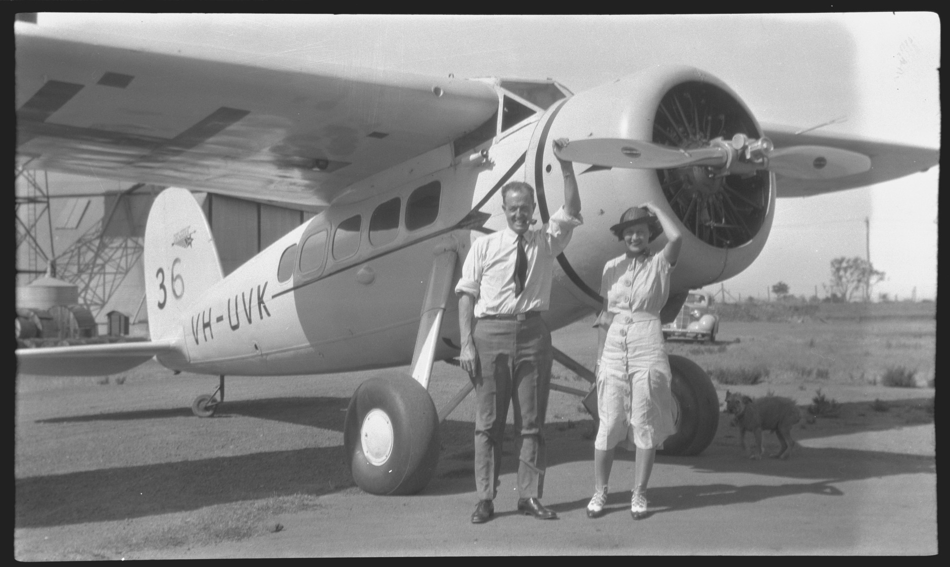 Title supplied by cataloguer. This image has been preserved and made available by the Historical Records Rescue Consortium Project supported by Lotterywest. 217223PD is Jimmy Woods and an unidentified woman in front of Horrie Miller's plane. VH-UVK Lockheed DL-1A Vega Special (construction number 155) Built in 1930, by Detroit-Lockheed Aircraft, Burbank, California, USA. Registered NC372E to Detroit Lockheed Aircraft. Registered as G-ABFE (Model 5 Vega) 30/9/1930 (an alternative source suggests 16/12/1930) to Lieutenant Commander Glen Kidson (who intended to build Lockheed Vegas under licence in the UK). It arrived in the UK by ship 1/1931 & was re-registered G-ABGK 3/1/1931 to Lt. Cmdr Glen Kidson, to incorporate his initials. Its UK Certificate of Airworthiness (V45) was issued 17/1/1931 and the aircraft was test-flown by Kidson at Croydon Aerodrome, London on 31/1/1931. It flew a record-breaking flight Croydon-Le Bourget 21/2/1931 & was used for other record flights, including Croydon-Capetown (via Napoli, Malta, Cairo, Kosti, Malakal, Kimusu, Salisbury & Bulawayo). Glen Kidson & his co-pilot Capt. T.A. Gladstone, were killed in a crash in South Africa 5/5/1931, in DH.80A ZS-ACG. G-ABGK was dismantled & shipped back to the U.K. by Kidson’s co-pilot Owen Cathcart-Jones. Cathcart-Jones continued to fly G-ABGK on behalf of Kidson’s family until its last flight 24/3/1933, when it was hangared at Hanworth Aerodrome. Purchased 8/1934 by Horrie C. Miller, sight unseen, for the Centenary London-Australia Air Race. Test-flown at Hanworth, 15/8/34, by Capt. Jimmy Woods, for its new owner. Overhauled by Dutch airline K.L.M. at Waalhaven, Rotterdam. Entered in the 1934 Centenary Air Race (U.K.-Australia) London-Melbourne (as N° 36) with Jimmy Woods as pilot and Don Bennett as navigator. It departed 20/10/1934 & flew to Marseilles, Roma & Athens. On 21/10/1934 it continued on to Aleppo, Syria, where Jimmy Woods made a heavy landing, causing the undercarriage to collapse. It was withdrawn from the race, dismantled & shipped to Fremantle. It arrived at Perth 1/1935, for rebuild at the MMA workshops. First-flown in Australia 22/8/1935, as G-ABGK. Miller was initially unable to obtain an Australian Certificate of Airworthiness (CofA), as it was an American aircraft. However, it was allowed to fly as G-ABGK, using its U.K. CofA. Capt. Woods flew the aircraft in the Perth Aerial Derby 5/10/1935. It raised more than a few eyebrows there, as it flew faster than the RAAF's Hawker Demon fighter-bomber. Its first MMA service was a charter, Perth-Kalgoorlie-Forrest-Ceduna-Adelaide, 13/10/1935. Horrie Miller requested the registration VH-BGK, to minimise repainting, but this was refused. It was test-flown by Horrie Miller 19/6/1936, in preparation for an Australian CofA. Registered VH-UVK to H.C. Miller 23/6/36 (Certificate of Registration No: 540), with an Australian CofA. The aircraft was registered to & belonged to Horrie Miller, rather than MMA, but was used by MMA on an ad-hoc basis, including communications between MMA bases & occasionally picking up mail from delayed flights. At one stage, R.M. Ansett tried to lease the aircraft, for use Melbourne-Hamilton, but Horrie Miller would not release it. MMA applied to have the Vega included under its airline licence in 8/41. However, it was impressed into service by the RAAF on 11/11/1941, and allocated RAAF serial number A42-1, just as Horrie Miller was planning to register the aircraft to MacRobertson Miller Aviation Co. Struck-Off the civil aircraft register 5/11/1941. Flown to RAAF 1 Aircraft Depot, Laverton, Vic, for use by Northern Area Headquarters. It was camouflaged, and saw service with 24 Squadron and 33 Squadron. It ground-looped at Cairns 17/6/1942, damaging the rear spar, an aileron & wing rips. It was trucked to Townsville & placed in storage. Repairs by Aircrafts Pty. Ltd. began in 10/1942 & took some 12 months. On 24/11/1943 it entered service with 3 Communications Unit, Mascot, Sydney. Declared surplus 3/1944; having flown only some 46 hours with the RAAF, and was issued to the Department of Civil Aviation (DCA). The DCA initially intended to issue the aircraft to Ansett Airways, but, as a result of reports by RAAF pilots of longitudinal instability problems, decided that the aircraft should remain in storage at 3 CU, at Mascot. During 10/1944, the DCA recommended to the RAAF that the aircraft be scrapped. Both Butler Air Transport (28/8/1945) & Jimmy Woods (15/10/1945) were interested in it. However, there was no sale, at least partly because the DCA stated that they would not renew the CofA, due to its stability problems. During 10/45 it was dismantled & trucked to RAAF, Richmond, NSW, where it was scrapped. Horrie Miller wrote to the Department of Defence, Canberra on 30/1/1973, stating that he was unable to find either any acknowledgment of impressment, or payment, for the loss of the aircraft. He was never compensated. (Info courtesy of Fred Niven)
