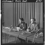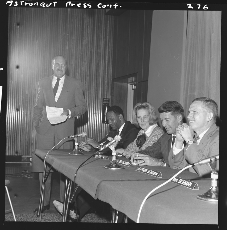 Walter Marty (Wally) Schirra Jr and Frank Borman were American pilot astronauts. Written on negative: Astronaut press conference, 1966.