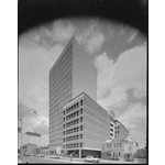Written on negative: Buildings around Perth, Nov 1971. Buildings include multi-storey Lombard house at 251 Adelaide Terrace; the small old style building is R & I Bank at 257 Adelaide Terrace and to the right, W.A. Police Union buildings.