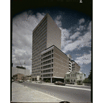 Written on negative: Buildings around Perth, Nov 1971. Buildings include multi-storey Lombard house at 251 Adelaide Terrace; the small old style building is R & I Bank at 257 Adelaide Terrace and to the right, W.A. Police Union buildings.