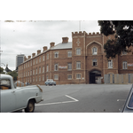 The two storey brick and shingle Pensioners' Barracks about to be demolished to make way for the Mitchell Freeway. The entrance has been fenced off and a banner reads 'A.B.C. Demolitions, men at work, absolutely no unauthorised entry, helmets must be worn'. After the demolition process only the entrance was left, commonly known as the Barracks Arch.