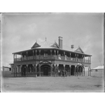 A group of men outside, and several women and children on the upstairs verandah, of the State Hotel, Johnson Street, Bruce Rock.