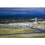 Aerial photograph of the International Terminal at Perth Airport, facing east from a position near the old control tower, on the west side of the airport. The new International Terminal was formally opened on 25 October 1986, and international operations moved there from the original 1962 terminal, which then became the Domestic Terminal. A McDonnell-Douglas DC-10-30 of MAS (Malaysian Airlines System – which became Malaysia Airlines in 1987) is on the left. To its right is a Boeing 747-244B of South African Airways – they ended services to Australia in 1987 due to Australia's opposition to South Africa's Apartheid Policy. Also visible is the new control tower, built in 1986 at the same time as the new international terminal. The tower is 80 metres tall, and was the tallest control tower in Australia for many years. (information supplied by D. Eyre, Aug. 2009)