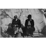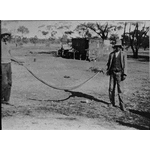060940PD Charlie Winmar and Sam Williams holding a long snake caught at Badjaling in the late 1920s. A camp is in the backgroound.