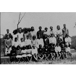 060931PD Standing at left L-R: Lottie Newell, Mary Yarran, Ruby Jackson and Gladys Winmar; kneeling next to the post is Simon Yarran, others unidentified, outside the first "Bush school" at Badjaling in the late 1920s