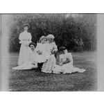 Henry Charles Prisep his wife Charlotte, daughters Emily, Virginia and Carlotta Brockman with Carlotta's daughter Caroline Brockman. The family are in the garden of the C.H.P. Prinsep's house 'The Studio' at 160 Hay Street, Perth. Virginia Prinsep later married Thomas Reynolds (1907)