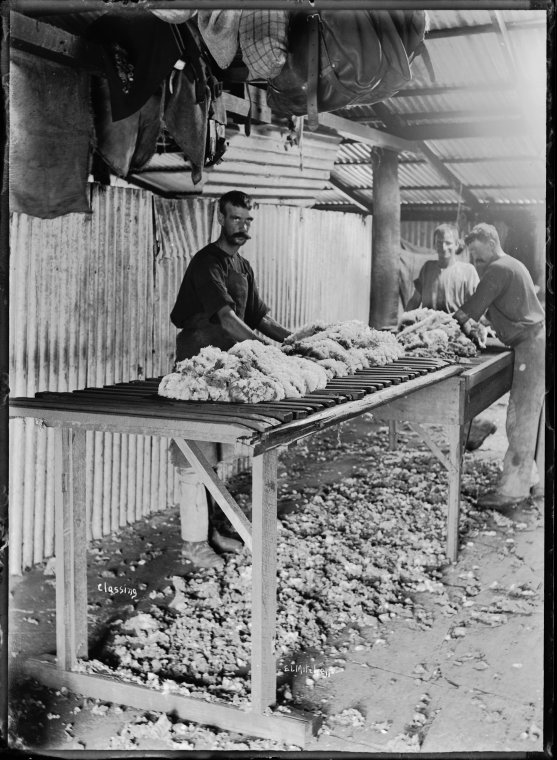 A collection of photographs of all aspects of the wool industry in the North West. This includes mustering with a group of musteres on Mallina Station, sheep, shearing including an Aboriginal shearing team with hand blades, classing, pressing wool, shipping wool and transporting it to port using camel trains, camel teams and the wool train at Roebourne.