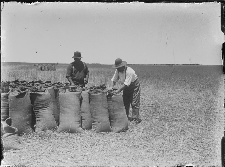 008494PD: Wubin - checking grain after harvest. Left Bill Klein (nephew of ) at right Wilhelm Gustav Liebe, 1922