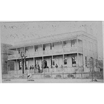 Some of the members standing on the verandah have been identified: C. H. Clifton; ? Smythe; A. E. Burt; unknown; Dr A. R. Waylen; unknown; John De Courcy Hillman; G. W. Leake; ? Samson; Fred Stone; Ernest Howard; George Leake or Charles Harper?