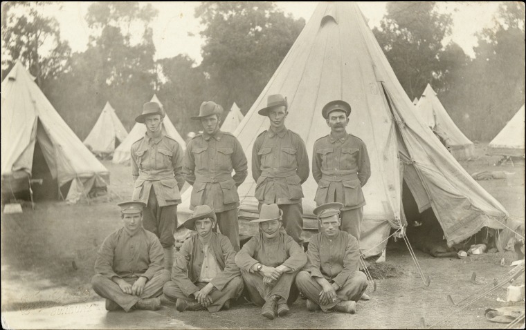 BA2629/60: Albert Pickles standing 2nd from left, Blackwood camp, 1914