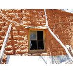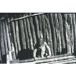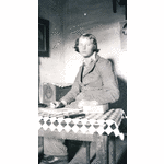Elizabeth Hettner doing correspondence in mud bat house ca 1933.