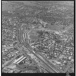 362283PD: A dual carriage by-pass of Bassendean on Guildford Road near the railway station, 15 July 1977. Bassendean Railway Station is in the foreground, Bassendean Oval can be seen centre