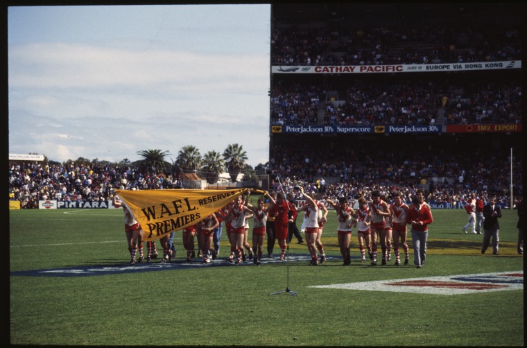 335029PD: South Fremantle Reserves Team with their Premiership Pennant on Subiaco Oval before the WAFL Grand Final played 24 September 1986