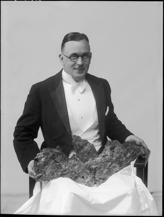 101371PD: Conductor Bert Howell poses with the Golden Eagle Nugget, 1931
