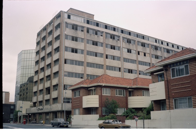 312302PD: L-R: Octogen Building (no. 200), Casablanca House (no. 196), Berkley Apartments (no. 190) Adelaide Tce, Perth, February 1983