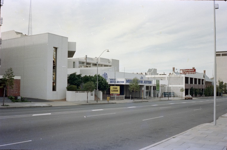 312223PD: L-R: Local Government House, Merlin Motor Auction, empty shop, Standard Chartered House, 134-122 Adelaide Tce, Perth, May 1983