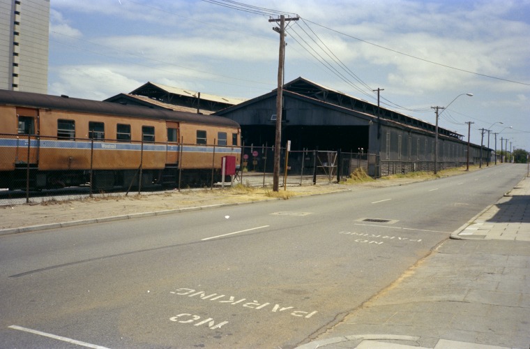 312400PD: Sheds in the Perth Rail Yard looking towards Milligan Street, January 1983