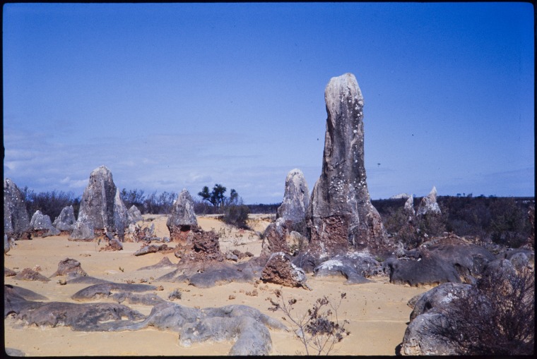 133274PD: Tombstone pinnacles in regeneration area, The Pinnacles, Nambung National Park, 1968.