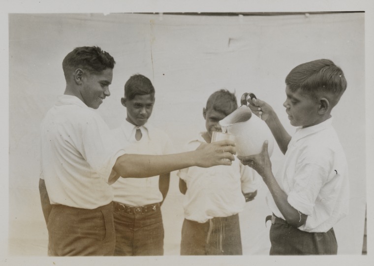 BA1340/ERA3/32C: L-R: Tom Murray, Freddie Meredith, Woobalee Blizzard and Ray McGrath conducting an experiment at Mt Margaret Mission School, ca. 1935